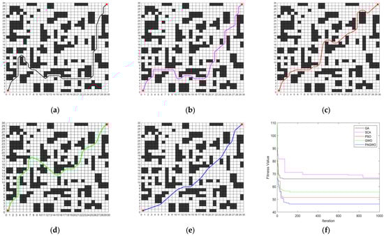 Path Planning Comparison of Different Algorithms in Simulation Map 1. (a) GA; (b) SCA; (c) PSO; (d) GWO; (e) PAGWO; (f) convergence curve comparison.