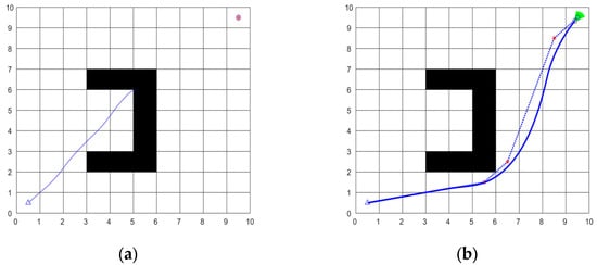 To evaluate the impact of incorporating PAGWO-generated global waypoints into DWA, the first experiment was designed with the mobile robot’s starting point at (1, 1) and its endpoint at (10, 10). In the simulation environment, the triangle denotes the start point, the circle denotes the goal, the asterisks represent local goal points generated by PAGWO, and the green area indicates the detection range of the DWA algorithm. The experimental results are presented in Figure 9. In Figure 9a, the robot is trapped in the local optimum and cannot reach the end point successfully, while in Figure 9b, the robot is guided to the endpoint by the global path of PAGWO and successfully arrives at the endpoint. This method effectively reduces the limitation imposed by a single global goal point on path planning, allowing the robot to complete the path planning task successfully.