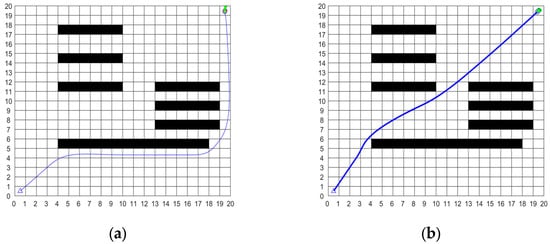 To evaluate the effect of the adaptive facing angle on DWA, a second set of experiments was conducted. In these experiments, the mobile robot’s starting point was set at (1, 1) and the endpoint at (20, 20). Path planning was performed using both the DWA algorithm and the PAGWO-IDWA algorithm on the same raster map, and the results are shown in Figure 10. In Figure 10a, the initial facing angle of DWA is directed toward the endpoint, causing the robot to deviate from the optimal path at the outset and resulting in redundant path segments. Furthermore, after encountering an obstacle, DWA continues to follow the wall because its facing angle remains fixed toward the endpoint, lacking adaptive guidance. In contrast, Figure 10b shows that during the initial stage of path planning with PAGWO-IDWA, the robot’s facing angle is oriented toward the PAGWO-generated path point. Under the correct guidance of this path point, the robot follows the optimal path to the endpoint, thereby verifying that the improved algorithm outperforms DWA in path optimization. The data for these experiments are presented in Table 5.