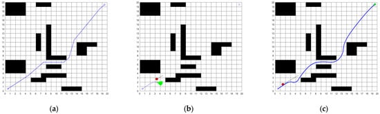 Dynamic Obstacle Avoidance Experiment 1. (a) Global optimal path; (b) the robot is bypassing to the right; (c) the robot reaches the goal.