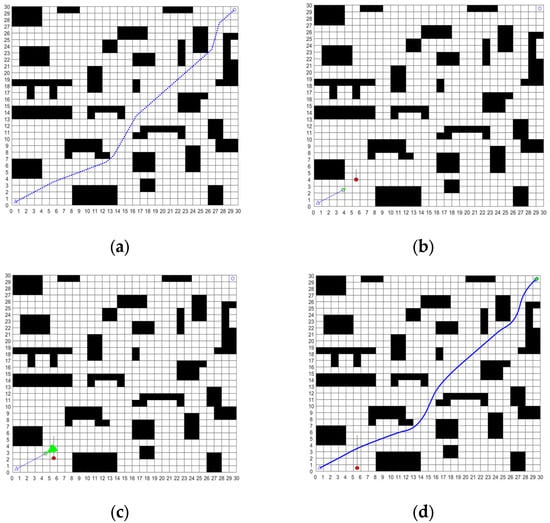 To further investigate the impact of additional obstacles on dynamic obstacle avoidance performance, we introduced five dynamic obstacles in map 2. Specifically, the first obstacle has start and end points at (6, 6) and (6, 1), the second at (7, 1) and (5, 7), the third at (14, 7) and (7, 5), the fourth at (15, 7) and (8, 5), and the fifth at (26, 23) and (17, 13). The mobile robot’s start and end points are (1, 1) and (30, 30), respectively. The experimental results are presented in Figure 14, where Figure 14a shows the globally optimal path identified by the PAGWO algorithm.