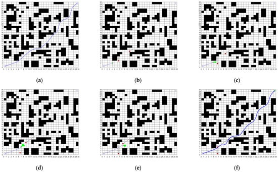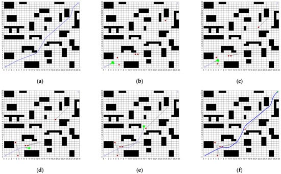 Dynamic Obstacle Avoidance Experiment 4. (a) Global optimal path; (b) the robot stops to avoid the obstacles; (c) the robot proceeds toward the goal; (d) the robot is bypassing to the right; (e) the robot is bypassing to the left; (f) the robot reaches the goal.