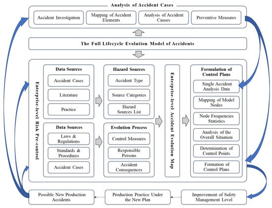 Building on the aforementioned safety management and accident causation logic, along with the accident development process, this study constructs the full lifecycle evolution model (FLEM), illustrated in Figure 2. It is essential to note that the primary responsibility for accident prevention and safety management rests with enterprises, while external factors primarily offer oversight and emergency resources. Consequently, this model emphasizes how enterprises manage accident risks, intentionally excluding the roles of government and society at this stage.