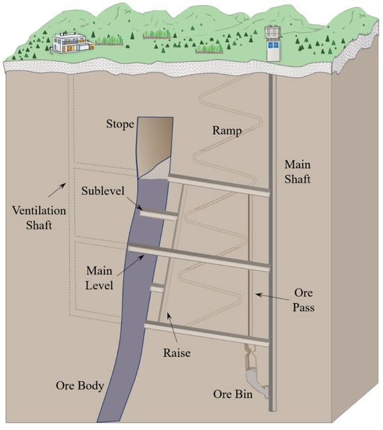 This study uses underground metal mining as a case study to demonstrate the practical application of FLEM. Underground metal mining entails the extraction of economically valuable minerals from deposits located beneath the Earth’s surface. The mining process comprises a series of activities, including geological exploration, mining design, tunneling, and the establishment of ventilation and drainage systems. This sector is characterized by complex working environments and the high frequency of accidents. Figure 4 illustrates the structure of an underground metal mining production system.