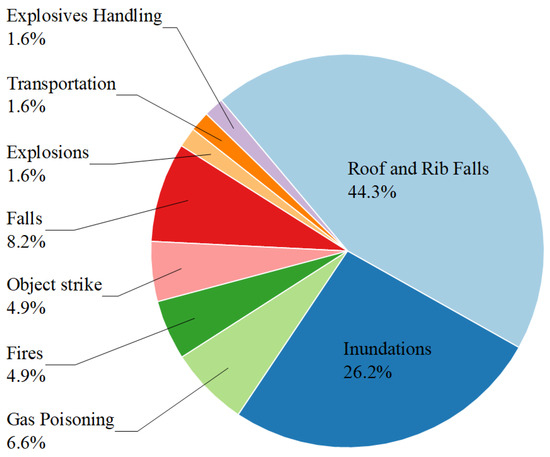 Due to the sensitivity of mining accident data, this study uses publicly published accident analysis reports as the data source. The accident case sources include accident investigation reports publicly available on websites of the Ministry of Emergency Management and the Mining Safety Supervision Bureau. These accident reports typically contain information such as the basic details of the accident-prone enterprises, casualties and economic losses resulting from the accidents, the sequence of events leading to the accidents, the direct and indirect causes, and the outcomes of the incident response. In this study, a total of 61 accident cases were collected, with the distribution of various types of accidents illustrated in Figure 5.