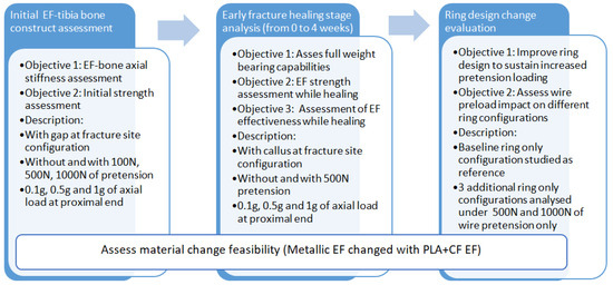 Initial EF–tibia bone design assessment—evaluates the axial stiffness and initial strength under varying loading conditions (0.1 g, 0.5 g, and 1 g, where g is the gravitational force equivalent for a 70 kg male expressed in N) and wire pre-tension levels (100 N, 500 N, and 1000 N). The analysis includes a fracture gap configuration to assess structural stability;