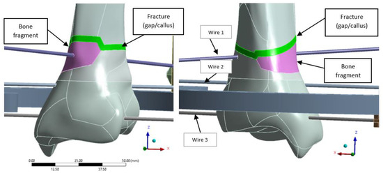 The contacts between the fragment, callus, and bone, the three K-wires, and the distal end/fragment and between the two pins and middle tibia bone were modeled with friction coefficient of 0.4 [