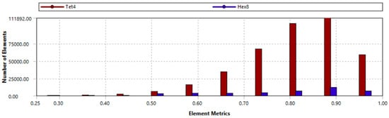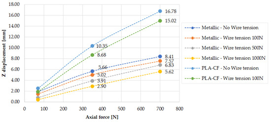 Figure 9a), three pre-tension forces of 500 N simulated wire loading, and one node was fixed to ensure isostatic constraint. For the PLA-CF configuration (