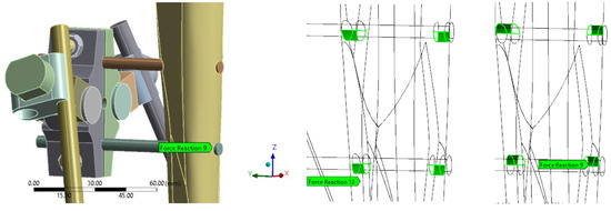 Reactions at pin interface were analyzed to assess the level of load transfer assured by EF in with callus at fracture site configurations only, and thus its effectiveness while healing. The sum of reaction forces from upper and lower side of the contact were considered as the pins are squeezed by the compressed bone resulting in reaction forces in Z+ direction in one side and Z- on the other side as shown in