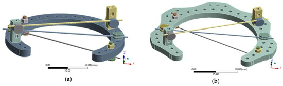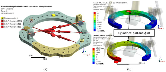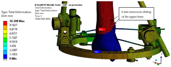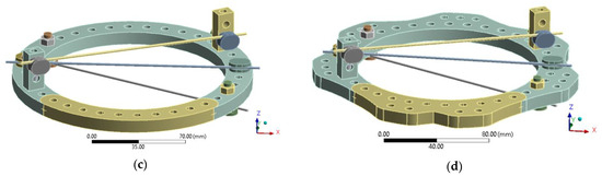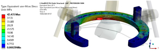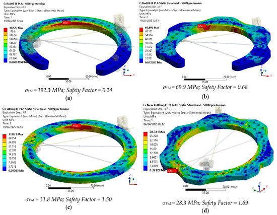 The following situations were analyzed: (1) metallic EF without wire pre-tension; (2) metallic EF with 500 N of wire pre-tension; and (3) 3D-printed PLA-CF ring without wire pre-tension. It should be mentioned that, for the PLA-CF ring, as shown in gap configuration analyses, for the current design, it was not possible to apply 500 N of wire pre-tension or more as the calculation convergence criteria were not satisfied within a reasonable number of iterations (<100).