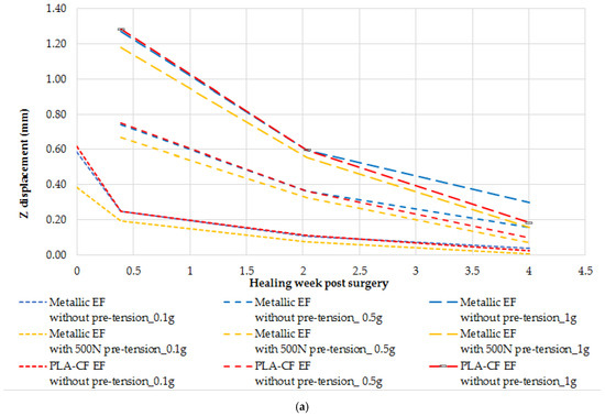 Figure 13 presents the displacements in the axial Z direction and in the transverse Y direction for different callus ages (i.e., stiffness). As observed, the displacements are within acceptable limits (less than 30% in the axial direction and 15% in the transverse direction), except for the fibrous callus under 1 g axial loading corresponding to the one-leg stance condition necessary to walk. The results showed that, due to high displacements at the fracture site, if healing proceeds normally, full weight bearing should be possible at the earliest after 2 weeks post-surgery.