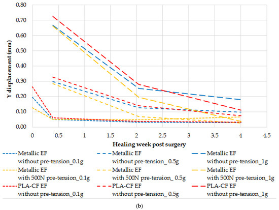 Table 2, exceed the allowable limit of the respective components. Acceptable results were observed only for the 0.1 g case with a 500 N wire pre-tension. In the 1000 N pre-tension case, all stress values remained within limits except for the EF ring, which exceeded the allowable threshold. Moreover, a progressive increase in the Y displacement was noted with both higher applied loads and increased wire pre-tension. This behavior is attributed to the pin placement, which is 121 mm away from the fracture site. The sliding of the pins, combined with this positioning, induces a rotational movement at the fracture location, contributing to the observed displacements.
