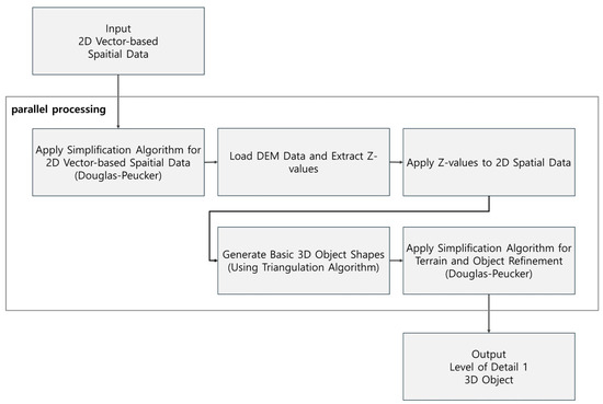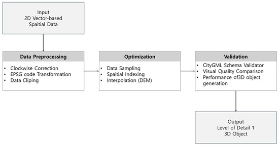 This study proposes a procedure for generating LoD1-level 3D objects by combining 2D spatial information data with high-resolution Digital Elevation Model (DEM) data. This procedure is designed to optimize 3D object generation processing speed, visual quality, and vector-based data processing, as shown in Figure 1.