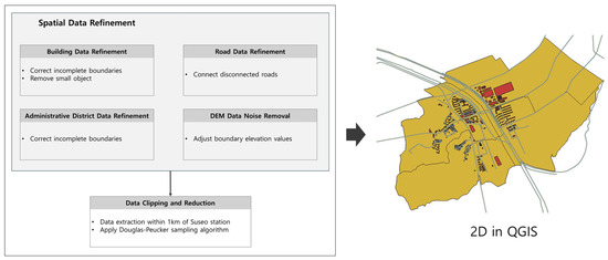 Following the coordinate system unification, additional preprocessing was conducted to improve the geometric accuracy and efficiency of the spatial data. This phase included noise removal and data refinement across multiple layers, including buildings, roads, administrative districts, and DEM, as shown in Figure 2.