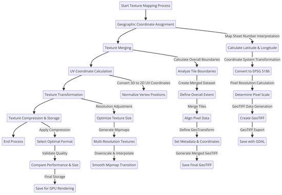 Collected texture data are efficiently converted using attribute information. For orthoimages, texture data position and size are precisely adjusted by referencing map sheet numbers and coordinate systems. During this process, merged texture-based UV mapping and geographic coordinate assignment techniques are applied to ensure accurate mapping of texture data to 3D objects. Converted textures are optimized for quality by reviewing resolution, contrast, and color consistency, while texture boundaries are adjusted to reduce visual discontinuity. Detailed explanations are provided in Section 3.3 and Section 3.4.