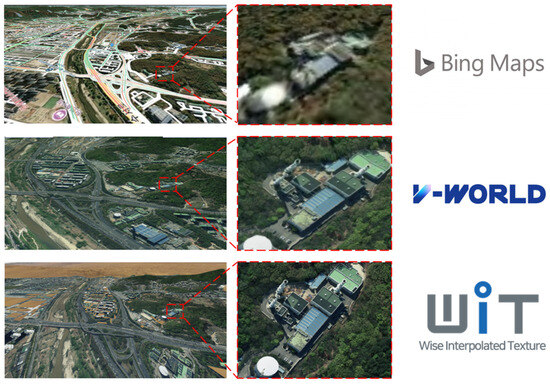 - Advanced Texture Mapping with WIT (Wise Interpolated Texture) Technique: This study applies the WIT technique to minimize discontinuities between interpolated textures and optimize high-resolution texture mapping based on orthoimages. This approach improves loading speed, reduces texture distortion through refined UV mapping alignment, and enhances visual fidelity in 3D representations. The experimental results demonstrate that the WIT-based texture mapping delivers smoother and more uniform visual outputs compared to commercial mapping services.