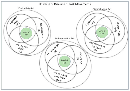 The Universe of Discourse S contains the intersection of three sets: biomechanical, anthropometric, and productivity. Each set shares a grade of membership at its risk level.