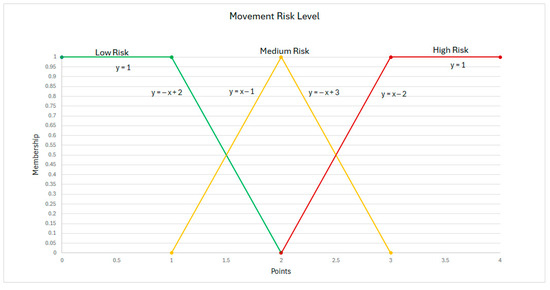 This procedure transformed a fuzzy solution (membership value) into a single output representing a biomechanical risk level. Ultimately, returning to a more precise or “crisp” world is generally necessary. This return is achieved through a process known as defuzzification. Defuzzification involves interpreting the membership degrees of fuzzy sets into specific decisions or real values [17]. Through this process, a second mapping converts fuzzy signals into their exact real-world counterparts. The lineal equation for the defuzzification was