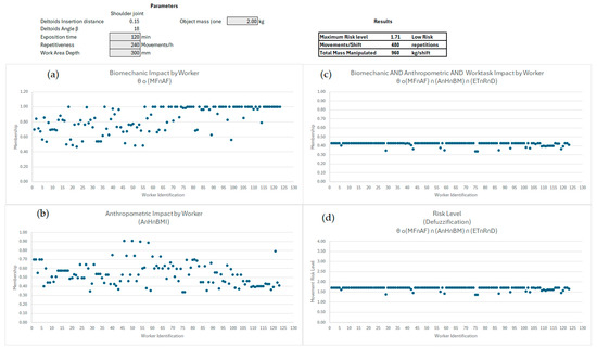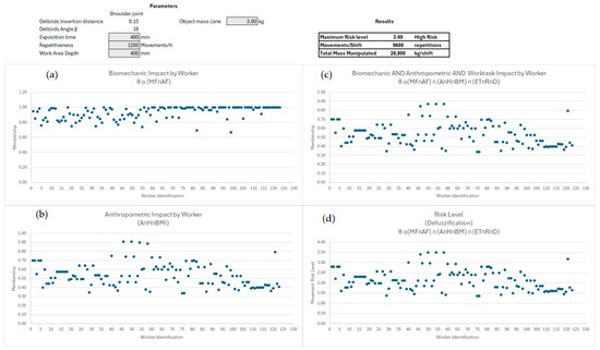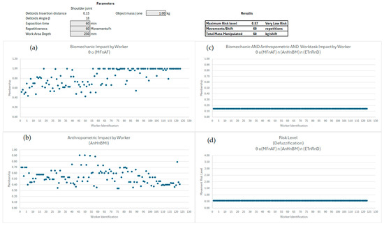 As previously mentioned, the DSS of this proposed model does not rely on fuzzy rules. It only requires the input data established for the productivity set. The membership is computed immediately, representing the risk level for each of the 123 workers according to their anthropometric characteristics. In Test 1 (see Figure 4), a task previously classified as very low risk was evaluated using the following specific values: ET = 60 min, R = 60 movements, D = 250 mm, and holding a 1 kg mass in hand. The Decision Support System (DSS), designed in Excel, displays several key pieces of information. It features a section for inputting biomechanical parameters—specifically the deltoids’ insertion distance and angle—and productivity metrics. The system computes and presents the resultant risk level, alongside four graphics that evaluate risk for each worker based on the following criteria: (a) Biomechanical Membership: This starts from 0.35 and ranges up to 1.00, indicating an increase from medium to high biomechanical impact. Workers are organised according to their height and Body Mass Index (BMI), with taller and heavier individuals positioned at the end. (b) Anthropometric Membership: This graphic illustrates the anthropometric characteristics of the workers. (c) Intersection Membership: This graphic displays the overlap among the three subsets—biomechanics, anthropometrics, and productivity. (d) Resultant Risk Level: Finally, this graph shows the defuzzified risk level for each worker.