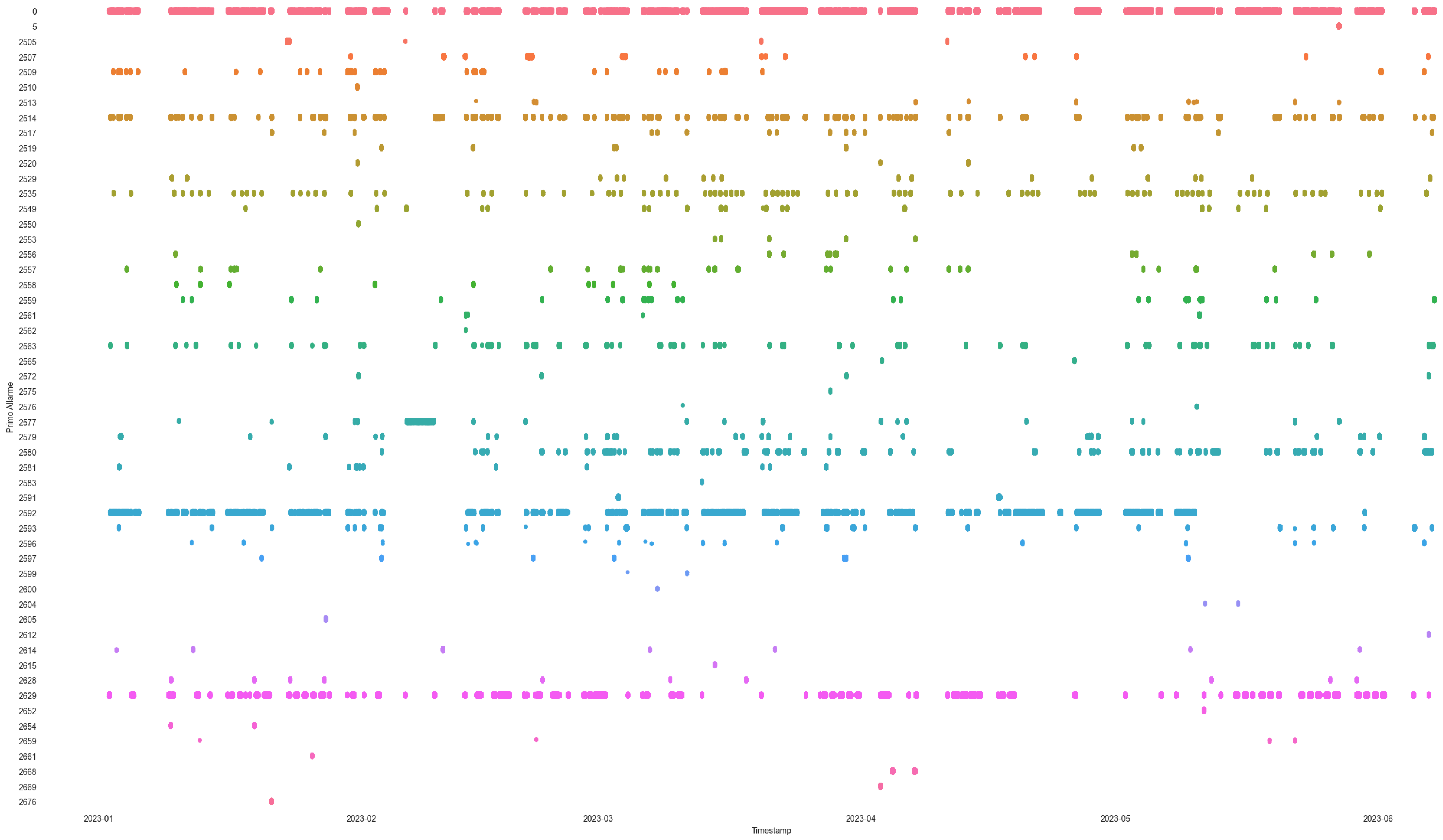 The analysis was specifically focused on critical errors associated with paper breakage, because when this happens, the recovery procedure takes time and effort, reducing the production rate until the problem is solved. The company’s domain experts suggested that the most trivial and important errors to identify in advance were those related to the tension of the paper and “paper breaking protection”: 2509, 2556, 2557, 2558, and 2559.