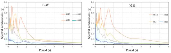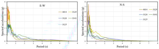 The spectral accelerations recorded during the Pazarcık and Elbistan earthquakes at different ground motion stations in the E-W and N-S directions are shown in Figure 3 and Figure 4 respectively.
