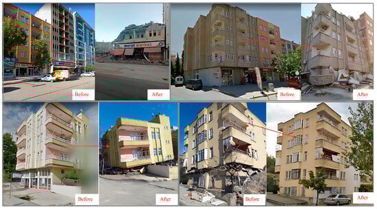 In order to understand the destructive impact of earthquakes, a comparison of the building conditions of four sample RC buildings before and after the earthquake is illustrated in Figure 6. The difference in strength and stiffness between stories caused partial or total collapse of the intermediate or ground floors. In such demolitions, it is not possible to strengthen and reuse the structure.