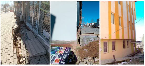 Soil liquefaction is the temporary liquefaction of the soil due to the increase in water pressure between the soil particles as a result of strong vibrations such as earthquakes. This situation can cause damage at different levels by causing the bearing capacity of the soil structure to decrease significantly [,,]. Examples of such damage are shown in Figure 7.