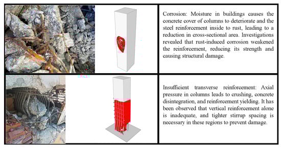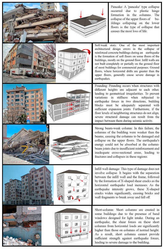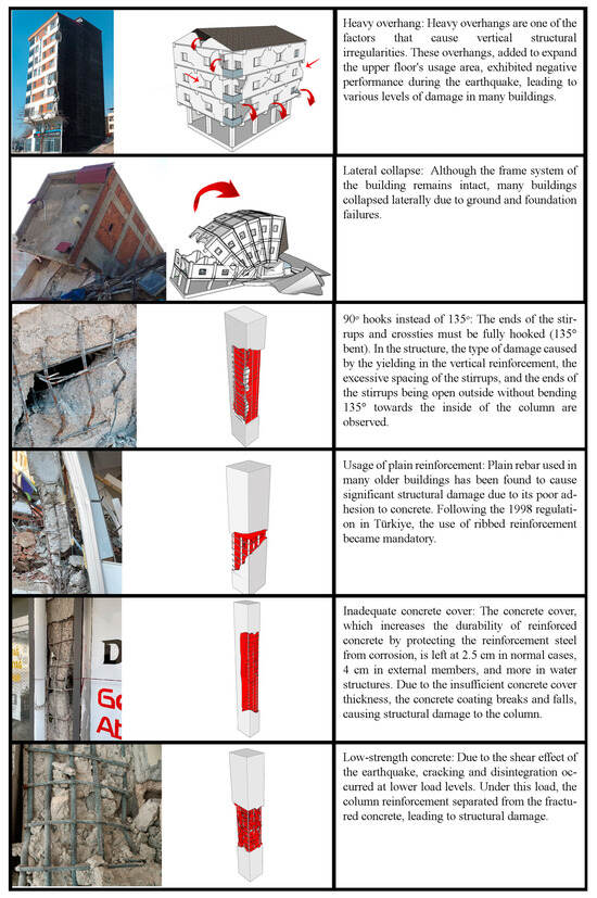 This study provides information on the damages commonly encountered in RC structures and their causes based on field observations. In particular, the lack of, or complete failure to apply, earthquake-resistant structural design principles has increased the extent of damage in RC structures. Examples of structural damage in RC buildings, their causes, and their schematic representations, which are commonly encountered in the earthquake region, are given in Figure 8.