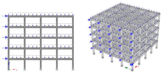 The dominant building stock in the city centers in the earthquake region consists of RC structures, particularly mid-rise RC structures, which are widely used in the region. The majority of RC structures that suffered varying levels of damage or destruction were mid-rise RC structures. The majority of medium-rise reinforced concrete buildings in the earthquake zone consist of 4–8 stories. In order to represent these structures, a 5-story building without any irregularities was modeled. Material properties in accordance with current seismic design codes were used as design criteria. The structural model was chosen to be symmetrical in both directions. In selecting the model building features, structural characteristics commonly used in practice were taken into account. Structural analyses were carried out for an example RC structure, considering the highest PGA values measured in eleven different provinces in the earthquake region, both from earthquake pairs and the PGAs estimated for these provinces in the last two earthquake hazard maps used in Türkiye. The analyses were performed using Seismostruct-2024 software []. In structural analyses, pushover analyses were conducted separately for each province. The RC building model is a 5-story structure with equal floor heights of 3 m. The building has the same span length in the X and Y directions, is symmetrical and each span is chosen as 4.50 m. The 2D and 3D models created for the sample RC structure and the applied loads are shown in Figure 9. RC columns were taken into account as square cross-sections in order not to create weak and strong directions for the structural model. Therefore, structural analyses were performed only in the X direction for all structural models. The RC building model selected as an example was chosen to represent mid-rise RC buildings in the earthquake region.