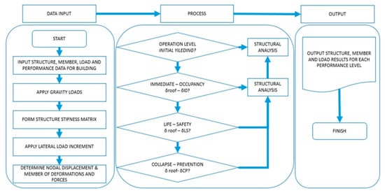 Pushover analysis, a numerical analysis method, examines how much structures or structural elements will deform under a certain load and how they will behave under the effect of these loads. In this type of analysis, elastic and plastic behaviors are generally taken into account. Pushover analysis is commonly used in earthquake engineering. This method is applied to predict how a structure will behave during an earthquake. Pushover analysis evaluates how much the structure will deform when pushed by static loads (usually with ground motion simulation) and at what point it may be damaged. It is simpler and can be completed more quickly than more complex dynamic analyses. This method allows for the assessment of displacement, rotation, and damage points of the structure [,,,,]. The flow chart of the pushover analysis procedure is given in Figure 11.