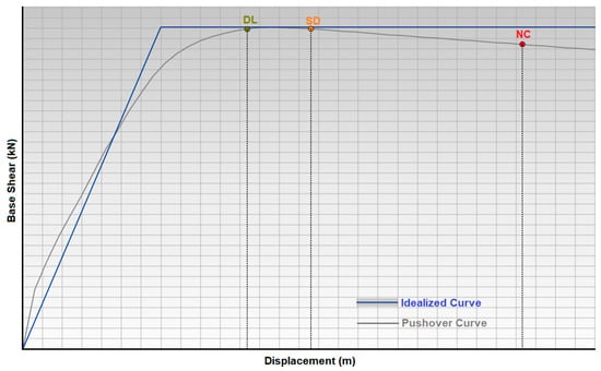 When the performance limits of particular structural components are reached, it is critical to determine the target displacement for damage estimation in performance-based earthquake engineering. An internationally accepted method for estimating damage, structural analysis, took into account the limit states specified in Eurocode 8-Part 3 [,]. These states are categorized as damage limitation (DL), significant damage (SD), and near collapse (NC). The values for these limit states were calculated for each structural model. Table 9 provides thorough justifications for the limit state values that were considered during this study.