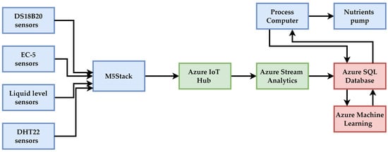 The proposed architectural workflow includes sending data from the sensors to Azure IoT Hub via the M5Stack. Azure IoT Hub directs the data to Azure Stream Analytics, which preprocesses it and then redirects it to Azure Machine Learning. This Azure component makes predictions and identifies whether activating the nutrient supply pump is necessary. This action is reported back to the Azure SQL Database through a flag. If the flag value is set to 1, the pump is activated. A cron job running on the process computer verifies the state of the flag each hour and activates the pump when necessary. After the pump starts, the flag is reset to the zero value.