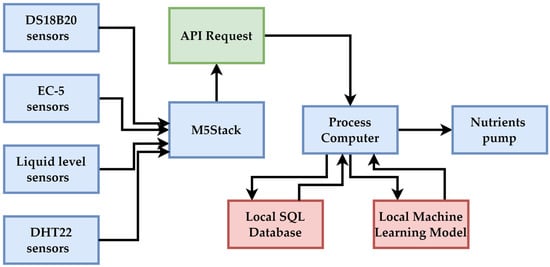 In the workflow associated with this scheme presented in Figure 3, the data is collected by the M5Stack module. The module sends a request to a Web address accessible within the local network. This request triggers a script that adds the data to an SQL Server database. Next, a cron job periodically runs a script that retrieves the most recent entry from the database and sends it to the local ML model, which decides whether or not the pump should be started. If the pump needs to be started, the script sets an indicator in the database to the active state. At the same time, another cron job runs on a process computer connected to the pump, executing a script that checks the indicator in the database. If the indicator is active, the pump starts, and then the indicator is deactivated in the database.