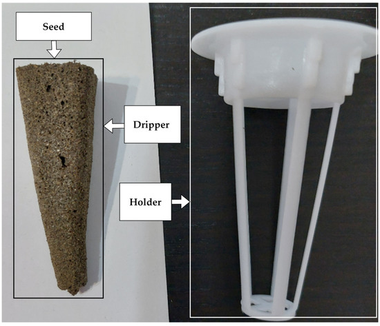 The automatic system from this research uses a Recovery Drip System type. It allows the recirculation of a solution consisting of water mixed with nutrients. The nutrient solution is redirected to the reservoir upon meeting certain conditions. The Recovery Drip System belongs to the class of Drip Irrigation Hydroponics systems. Figure 4 presents the constituent elements of this system, where the seed is placed. The seed is deposited in the Dripper, which absorbs the substance, providing a favorable environment for plant development. Essentially, the Dripper replaces the soil, which supplies the nutrients necessary for plant growth. In the absence of soil, the Dripper is soaked with the water-soluble nutrient mixture. The drippers and the seed are placed in a support called a Holder. The Holder is periodically supplied with the liquid mixture in a PVC pipe.