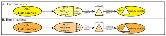 Furthermore, we split the datasets of two species into training and test subsets according to the ratio of 8:2. As shown in Figure 2, the benchmark dataset from E. coli include 1932 samples of wild-type enzymes and 1030 samples of mutant enzymes. To maintain the ratio of wild-type and mutant enzymes, we randomly selected 386 wild-type and 207 mutant enzyme reaction samples to form the test set, and the remaining 2369 samples were assigned to the training set. Similarly, the benchmark dataset from H. sapiens include 5823 samples of wild-type enzymes and 1337 samples of mutant enzymes. Following the same procedure, we randomly selected 1164 wild-type and 268 mutant enzyme reaction samples to form the test set, and the remaining 5728 samples were assigned to the training set. Finally, by merging the training sets (resp. test sets) of E. coli and H. sapiens, we obtained a total of 8097 training samples and 2025 test samples, which can be referred to in Table 2.