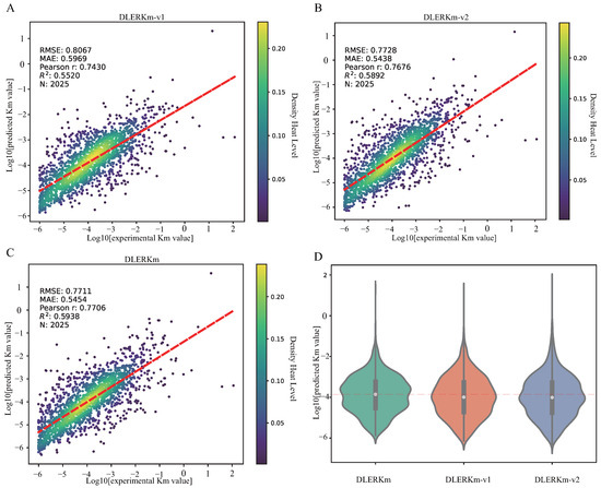 Prediction results and performances of DLERKm and two variants. (A) Scatter plots of prediction results for DLERKm-v1. (B) Scatter plots of prediction results for DLERKm-v1. (C) Scatter plots of prediction results for DLERKm-v2. (D) Violin plot of prediction results for DLERKm and two variants.
