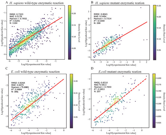DLERKm prediction results visualization for different types of enzymes. (A) DLERKm prediction results visualization for wild-type enzymes of H. sapiens. (B) DLERKm prediction results visualization for mutant-type enzymes of H. sapiens. (C) DLERKm prediction results visualization for wild-type enzymes of E. coli. (D) DLERKm prediction results visualization for mutant-type enzymes of E. coli.