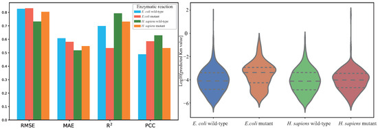Furthermore, we divided the corresponding test samples of H. sapiens and E. coli into wild-type enzymatic reactions and mutant enzymatic reactions. As shown in Figure 11, the DLERKm prediction results show considerable goodness of fit in predicting Km across all datasets. Moreover, Figure 12 shows that DLERKm prediction performance on H. sapiens wild-type enzymatic reactions is better than on other enzymatic reactions. Additionally, the violin plot indicated that the prediction results have a smoother distribution on the dataset. Specifically, as shown in Table 9, for wild-type and mutant enzymatic reaction samples in H. sapiens, the prediction results of DLERKm on the H. sapiens wild-type enzyme samples demonstrate better accuracy for the four evaluation metrics, where the relative improvements of the four evaluation metric values are 9.8%, 5.9%, 17.6%, and 6.18%, respectively. In addition, for enzymatic reaction samples in E. coli, DLERKm demonstrates better prediction results on the mutant enzyme samples. Although RMSE slightly increases, MAE achieves an improvement of approximately 4.3%, and R2 and PCC increase by approximately 19.8% and 9.4%, respectively.