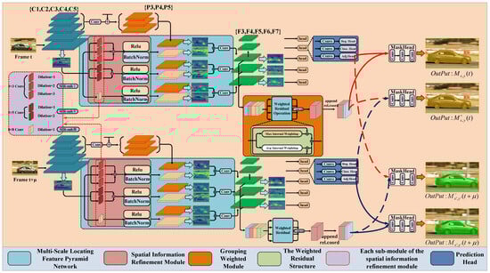 The overall structure of MLGW-VIS network includes two stages: feature extraction and post-processing. As shown in Figure 1, in the feature extraction stage, we set frame t and frame of the current video are input into the ResNet50 [] backbone network to extract semantic features C1, C2, C3, C4, C5, respectively. Then, FPN is used to perform top–down upsampling and addition operation to fuse high-level and low-level features to obtain feature maps with multi-scale semantic information P3, P4, P5. Aiming at the lack of spatial location information of high-level semantic features in FPN, a multi-scale positioning feature pyramid is proposed. The FPN high-level features not only have rich semantic information, but also obtain more spatial location information to locate the object. P3, P4, and P5 receive the output features F3, F4, F5 of the multi-scale localization feature pyramid after supplementing the spatial location information by the spatial information refinement module. The features P6, P7 are obtained after two-time downsampling. In the post-processing stage, the multi-scale positioning feature pyramid output features F3, F4, F5, P6, P7 generate prediction heads, respectively, and use F3, F4, F5 for upsampling and additional operation to generate mask features. Then, the relative position matrix and mask features are spliced and sent to the mask head dynamic convolution. Among them, the mask dynamic convolution structure is controlled by the adjusting head as a variable matrix, and finally the mask dynamic convolution outputs the instance mask. Instance masks are divided into static instance masks and dynamic instance masks. In the mask generation part in Figure 1, the solid line represents the static instance mask, the dotted line represents the dynamic instance mask obtained by cross-learning, the red represents the mask generation process of the frame t, and the blue represents the mask generation process of the frame image. The process of generating static instance masks for frames and t can be expressed as follows: