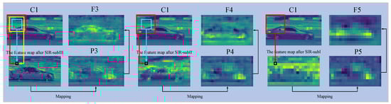 where (·) represents the convolution operation with a 3 × 3 kernel, and , respectively, represent the feature graphs in MSL-FPN (F3, F4, F5) and (P3, P4, P5); (·) denotes the 6-i submodule of SIR; is the first feature map C1 generated by convolutional pooling in the input backbone network shown in Figure 1.