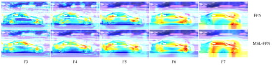 Figure 2 shows the feature map visualization results of Layer C, Layer P, Layer F, and Layer C in MSL-FPN after the spatial information refinement sub-module. It can be seen from the results that the feature extraction effect of Layer P is significantly enhanced after the feature mapping of Layer C, which verifies that MSL-FPN can extract more key semantic features from feature maps. Figure 3 is the heat map visual comparison of the output features of the original network FPN and MSL-FPN in F3, F4, F5, P6, P7. The color of the heat map varies from blue to red, indicating that the heat value is from low to high. The higher the aggregation degree of the high heat value area in the heat map in the target area, the higher the attention of the network to the target area. It can be clearly seen from Figure 3 that MSL-FPN has a higher degree of high thermal value aggregation in the target area than the original network FPN, and the degree of high thermal value aggregation in the target area increases with the depth of the feature map, indicating that MSL-FPN can extract the spatial location information of low-level features to supplement the high-level features so as to locate the target more accurately.
