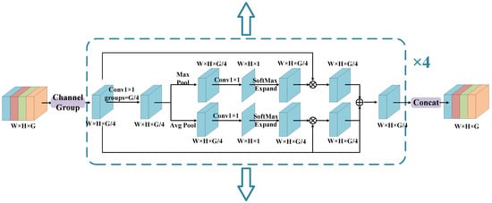 where denotes grouping weighted features; (·) represents the concatenation operation; , , , for the mask features divide the channel after each group; represents the internal pooling weighting operation for each group of features. is the Max pooling weighting in the internal pooling weighting operation. is the average pooling weighting in the internal pooling weighting operation. (·), (·), and (·) are max pooling, average pooling, and normalized exponential functions, respectively.