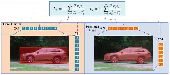 The calculation process of projection loss is shown in Figure 5 where the left side is the true value of the bounding box. Assuming that the image pixel is a matrix of the form , the row matrix XG and the column matrix YG are established, respectively. The form is the and vector, respectively. The right side of Figure 5 is the prediction mask, and its image pixel matrix is in the form of . The maximum probability of the prediction mask pixel matrix being the foreground object is calculated in the row and column directions, respectively. The calculation result is value of the two vector matrices and . The two vector matrices are row matrix XM and column matrix YM, respectively; XM and YM are of the form and , respectively.