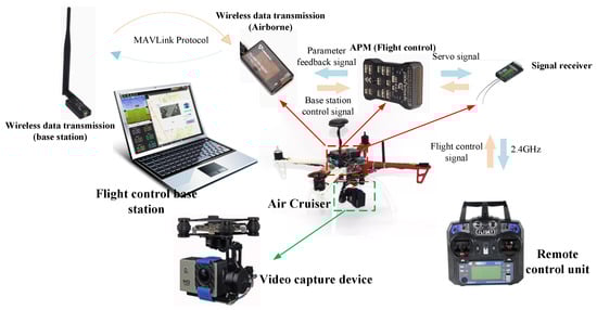 The overall flight control architecture is shown in Figure 8. The controller controls the device by mode switching and flight control commands issued by rocker operation through the remote control connected with the base station calibration. The communication between the remote control and the signal receiver is through the 2.4 GHz frequency band, and the signal receiver is connected with the flight control hardware through the Pin interface. Furthermore, the remote signal is converted into the motor servo signal to complete the control of the four-axis motor. The flight control base station is developed and deployed on the laptop. The laptop and the airborne end are connected by wireless data transmission to establish MAVLink protocol communication between the flight control base station and the air cruiser device so as to obtain real-time feedback of various parameters and transmission of base station control signals.