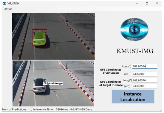 Our network is built by Python for code programming and model training output in Linux system. In order to use the model to carry out image sample inference in the cross-platform Winform software with better performance, ONNX conversion and C# ONNX Runtime invocation of the trained video instance segmentation model.pt weight file are required. Firstly, the Onnxruntime environment code is introduced into Python and the onnx.export function is called to sort out the weight value of the model, the network flow information of the neural network, the input and output information of each layer network, and other auxiliary information and output it into an ONNX file. Then, the converted video instance segmentation model ONNX file is imported into the flight control software running directory, and the InferenceSession object is created by the API of ONNX Runtime in C# project to load the model in ONNX format. Subsequently, input data are prepared according to the requirements of the model, which involves image preprocessing (such as scaling, normalization, etc.), and the preprocessed input data are passed to the model, and the output of the model is obtained. Then, the ONNX model is calculated to obtain the float DenseTensor including mask features, mask predictions, and bounding box regression predictions to perform three tasks of classification, bounding box regression localization, and instance mask region color coverage, respectively. In addition, the Rectangle function of OpenCVSharp is introduced to build the rectangular boxes of instances according to the bounding box regression corners. The PutText function is applied to label and draw the scores of the instances and probabilities and construct the rectangular boxes for the instances. Next, the mask areas are generated after the mask feature binarization process and the output is shown in Figure 9. Finally, the instance positioning coordinates are solved based on the instance mask center point coordinates.