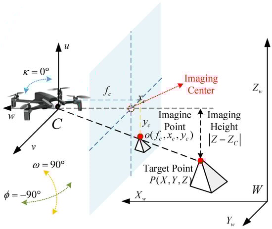 Further, according to the image coordinates of the image point o with the camera focal length transformation, the world coordinates of the cruise flying origin are C and the target world coordinates are in and directions from , . Further, we consider the Earth as a regular sphere, where the Earth’s radius is 6,371,000 m, the circumference of any Earth’s longitude is 40030173, and the circumference of a particular latitude can be calculated as meters. On the basis of combining cruise flying shot coordinates calculating the target coordinates, the specific expression is