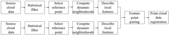 The main process of the proposed point cloud data registration method based on dynamic neighborhood features is illustrated in Figure 1. After acquiring the source and target point cloud data, statistical outlier removal is first performed to filter out noise. Subsequently, the point cloud is divided into small, equally sized voxels, and the centroid of the points within each voxel is selected as a feature point. A dynamic neighborhood is determined for each feature point based on its local average curvature, point cloud density, and detail coefficients from a curvature-based wavelet transform. The local feature descriptor for each feature point is then constructed as a cumulative histogram of the projected distances from the remaining points within its dynamic neighborhood onto the feature point along the direction of maximum principal curvature. Feature point pairing is achieved by calculating the chi-squared distance between the cumulative histograms of the projected distances for feature points in the two point clouds. The pair with the minimum chi-squared distance is considered the best match and retained. Matching pairs with chi-squared distances exceeding a predefined threshold are discarded to improve matching accuracy. Finally, the transformation matrix between the source and target point clouds is computed using the retained best matching pairs. This transformation matrix is then applied to register the source point cloud to the target point cloud [15,16].
