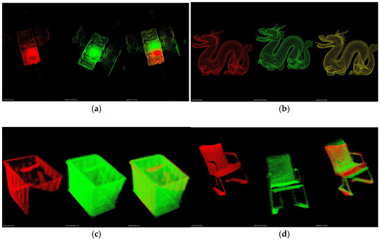 The data used for point cloud data registration are house point cloud data (a), Dragon point cloud data (b), storage box point cloud data (c), and chair point cloud data (d). The registration results are shown in Figure 5.