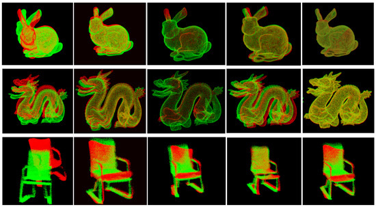 Figure 6 provides a comparative visualization of registration results. Three datasets are used: the Stanford Bunny, the Stanford Dragon, and a chair dataset captured with LiDAR (arranged from top to bottom). The columns display, from left to right: the original, unregistered point clouds, the point clouds registered using K4PCSs, the point clouds registered using a KD-tree-based improved ICP, the point clouds registered using 3D-NDT, and the point clouds registered using the proposed method.