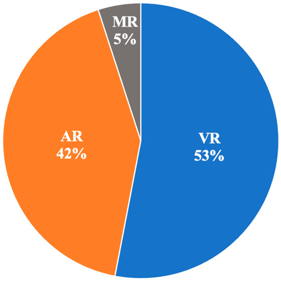 The analysis of Figure 3 reveals that among the 56 selected studies, 32 (53%) utilized virtual reality (VR) ([5,11,13,16,17,18,19,20,21,22,23,24,25,26,27,28,29,30,31,32,33,34,35,36,37,38,39,40,41,42,43,44]), 25 (42%) employed augmented reality (AR) ([7,12,13,16,36,38,45,46,47,48,49,50,51,52,53,54,55,56,57,58,59,60,61,62,63]), and 3 (5%) implemented mixed reality (MR) technologies ([9,64,65]). VR, known for its immersive teaching experiences, has been extensively applied in high-presence educational settings such as medical simulations or industrial training. In contrast, AR, which integrates real-world environments with virtual information, has been utilized in courses requiring field observation or hands-on activities, such as engineering and natural sciences. MR, due to its higher technological and equipment requirements, appears to be primarily adopted in advanced courses with significant interactive demands, such as design and architectural simulations. Notably, four studies explored the simultaneous application of VR and AR technologies in educational contexts.